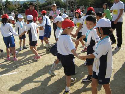 これは,はじめのしきで葵小学校の2年生と交流し,準備体操・応援合戦をしているところです。