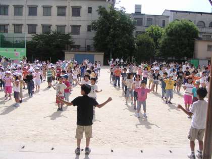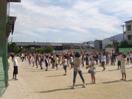 夏休みのラジオ体操に向けて,運動委員会をリーダーとして,全校練習をしています。