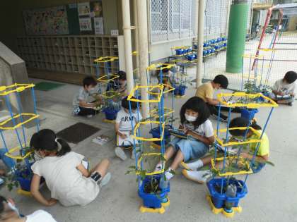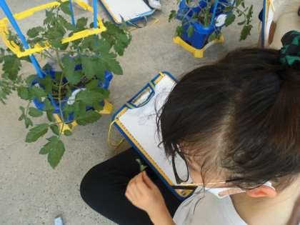 国語「かんさつ名人になろう」の学習で,今日はミニトマトを見ながら絵を描きました。本物そっくりの色を塗ったり,細かいところまでしっかり観察したりと頑張っていました。