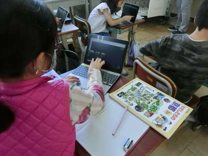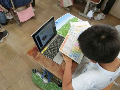 社会の学習で,京都市の様子をロイロノートスクールでまとめました。ワークシートと写真を用意し,それぞれの場所と学校との位置関係,特徴などをまとめました。文字入力はまだ慣れていないのですが,国語で学習したローマ字を表を見ながら一生懸命入力していました。