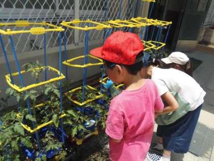 生活「ぐんぐんそだて おいしいやさい」で育ててきたミニトマトがどんどん成長しています。黄色い花が咲いたり,小さな実ができてきたりしています。毎朝水をやり,脇芽をとって一生懸命お世話しています。