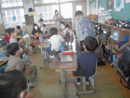 総合の学習で左京南地域包括支援センターの方々に,出前授業を行っていただきました。出前授業は「高齢者疑似体験」と,「認知症サポーター講座」の二回行っていただきました。