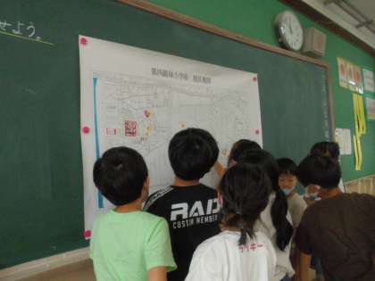 紹介方法もすべて子どもたちが一生懸命考え,大きな地図におすすめの場所をまとめ,廊下に掲示しています。