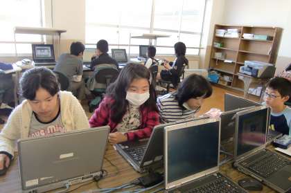 6年2組の子どもたちを1組担任の小寺先生がコンピュータ室で指導しています。(写真の中に小寺先生は映っていません。ごめんなさい。)コンピュータを操作して,自前の歴史クイズを作成中です。