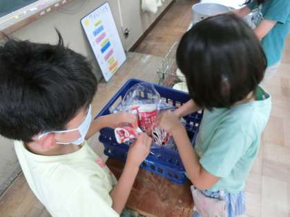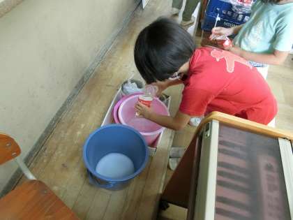 各教室では、きれいな水の入ったバケツからカップで水を汲み、牛乳パックをすすいで、もう1つのバケツに流すという作業を進めています。1年生の子どもたちも、慣れた手つきで牛乳パックのリサイクル活動をしています。