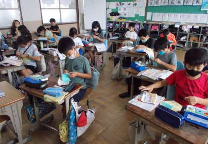 5年生の家庭科の学習で縫い物の練習をしています。何度も繰り返して波縫い・本返し縫い・半返し縫い・かがり縫いの練習をしたり,ボタンを付ける練習をしたりしたおかげで,随分と縫い物の技術が身についてきました。