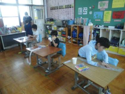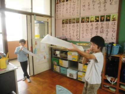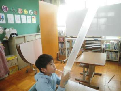 図工の時間に工作をしました。ストローに息を吹きこみ何度もにょきにょき出すのを楽しんでいました。