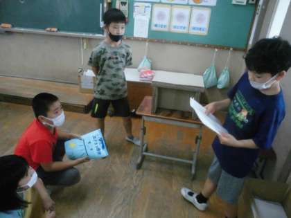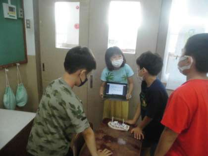 明日の自由研究発表会に向けて、グループで練習しました。お互いに見合いアドバイスをしたり、質問をしたりしました。