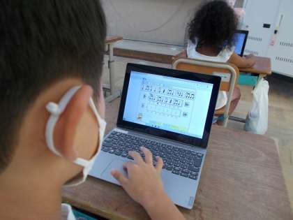 今日は「くりかえしを使って音楽をつくろう」というめあてで、GIGA端末でスクラッチというソフトを使ってくりかえしのリズムづくりを行いました。GIGA端末を使うことで簡単に曲を作って、聞いて、作り直すことができます。今日はソフトにデータを読み込むところで時間がかかってしまいましたが、これからの学習でたくさんの曲を作りたいと思います。子どもたちも楽しみにしているようでした。