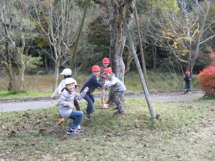 今日の校外学習では,宝が池まで叡山電車で活き,まず「いこいの森」で1年生・2年生の仲良しグループで一緒に活動をしました。事前に何をするか相談していたので,すぐに動き始めていました。