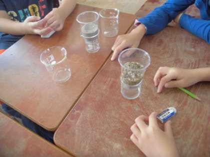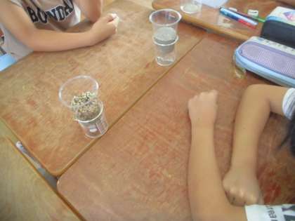 今日は「水は地面にしみこむのだろうか」という学習問題を解決するために、校庭の砂と砂場の砂の手触りや粒の大きさを見たり、水を入れてしみこむ様子を観察しました。