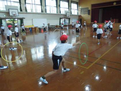今日はフラフープを転がしたり,棒を手の上に乗せてバランスをとったりと,いろいろな用具を使った遊びに挑戦しました。