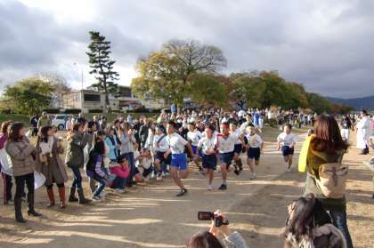 第26回大文字駅伝の支部予選会が賀茂川西岸の河川敷で行われました。支部13校の精鋭が集う予選会で来年2月の本大会に進めるのは上位3校のみ。どのチームも日頃鍛えた走力と団結力を今日のこの日にぶつけます。