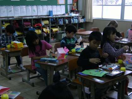 まず,箱を自分たちで作りことから始まった学習でした。今日は,いよいよ箱の外側の飾りと中のプレゼント作りです。お手紙を書いて中に入れていたり,折り紙を折ってそれにメッセージを書いて中に入れたりして工夫していました。