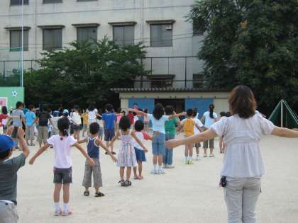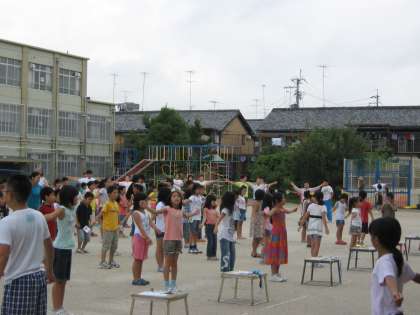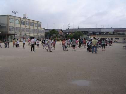 昨夜の大雨がうそのように,朝から雨があがり,地域の方,子どもたちたくさんでラジオ体操をしました。学校の方では,ラジオ体操第1第2を曲に合わせて,元気よく行いました。そのあと,25日の「吉田区民夏まつり」に向けて女性会の方の協力で,盆踊りの練習をしました。なかなか難しいですが,頑張って円になって練習をしました。