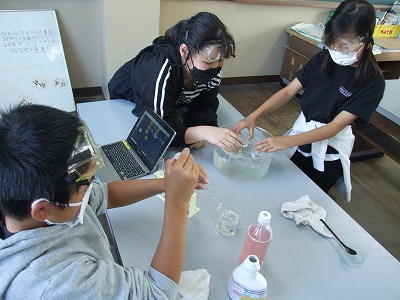 紫キャベツを使って液性を調べたり、塩酸で金属を溶かしたりしました。