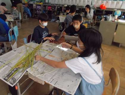 稲刈りの後は刈った稲の観察会をしました。稲の茎に空洞が空いていることや,コシヒカリと大地の風を比べて,大地の風の方が稲が太いこと等に気づいていました。気づいたことはGIGA端末を使ってしっかりと記録していました。本当によく観察して細かいことに気づいていたので,お米博士にたくさん褒めてもらえました。