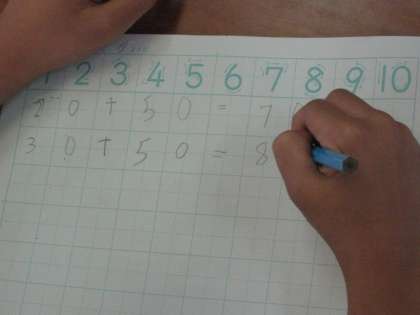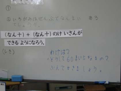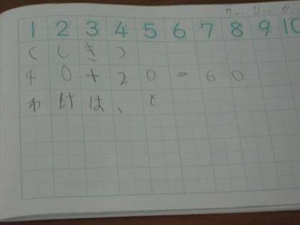 第1学年の3組の児童は,今,「学ぼう算数」をもとに,発展的な学習に取り組んでいます。20+50,30+50,40+20,40+60,40+70…と2位数の加法(たし算)を学習しています。和が100を超える計算は第2学年で学習しますが,今回,私は,和が100を超える計算と20+50が何故70になるのかを文で記述する学習を仕組みました。「40+20=60,わけは10が4つと10が2つで10が6つで60になるからです」というように記述することを教えます。そして,10問以上の問題に挑戦させ,途中の何問かに,わけを言うように展開します。第1学年の児童は見事,100%正解!また,わけもきちんと言えました。記述することが思考力を育てています。