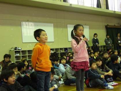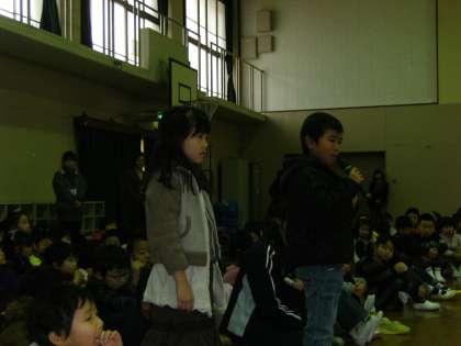 各学級から2名の発表者が前に出て「おこだでませんように」の絵本について,自分たちが感じた事を発表しました。1年生は,「ふれあい集会」の参加自体が初めてでしたが,発表も聴く態度も大変良かったです。事前の学習で,全員が書いた感想文は,教室前の廊下に掲示していますので,個人懇談会で来校していただいた時に見てください。