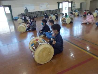 子どもたちは座り方がお父さん座りだったり、たたくバチが左右で違ったり初めてのことでだらけで驚いていましたが、丁寧に教えていただいたおかげで、最後にはリズムにのって、速いスピードでたたくことができました。
