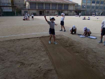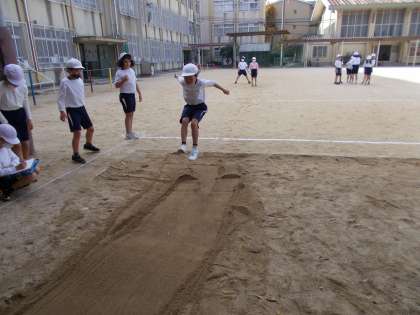 着地をするときに後ろに倒れてしまって、跳んだ距離が短くなった子が何人かいたので、前に倒れるように気をつけてほしいと思います。