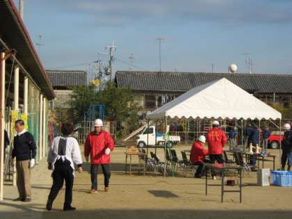 体育館前では,臼と杵の準備ができました。昨年は,「ふれあいもちつき大会と炊き出し訓練」でしたが,今年は,防災訓練も兼ねています。PTAの方もたくさんもちつきのお手伝いに来ていただきました。早速おもちをついたり,もち米を運んだり・・と大活躍です。 ありがとうございます。