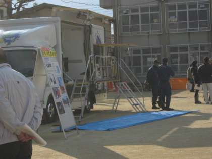 消防署・消防分団の方も見え,起震車も登場です。東門から入ったところでは,煙の体験準備や救急車もあります。また,シートをひき,いろいろな処置について教わる用意もできています。