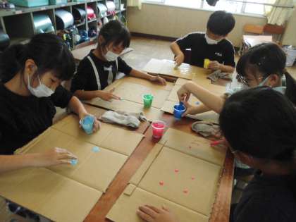 図工では「とろとろえのぐで かく」という学習をしました。液体ねんどにえのぐを混ぜて色を作り、指や手を使って描いていきます。子どもたちは、その感触を楽しみながら絵をかきました。