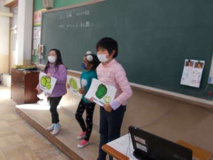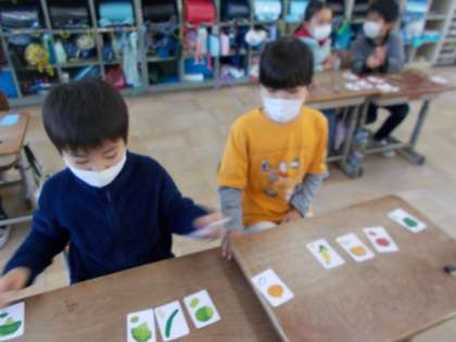 。先生の発音する野菜をしっかりと聞き取り、正しいカードを取る「ポインティングゲーム」をして楽しみました。さらに2組では、英語が得意な子どもたちが、先生役として大活躍してくれました。
