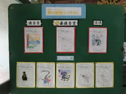 飼育委員会の子どもたちの企画で、「夢の動物コンテスト」を行いました。こんな動物がいたらいいなと思う絵にかいて応募し、飼育委員会の子どもたちが選びました。玄関ホールに掲示していますので、個人懇談会などで学校にお立ち寄りの際にご覧ください。