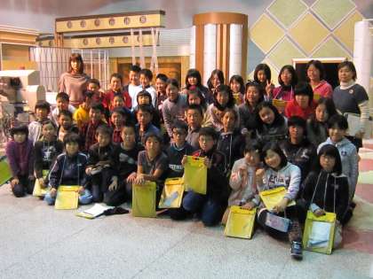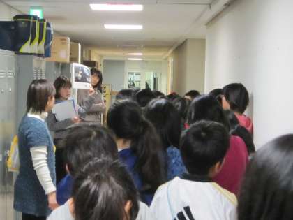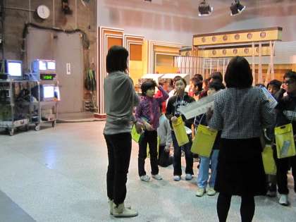 キャスター体験のあとは、実際のスタジオの見学です。京都放送局の中で一番大きなスタジオに入り、キャスターを映す大きなカメラや天井からぶら下がるたくさんの照明器具、スタジオのセットを見学しました。