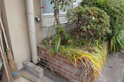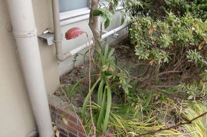2枚目の写真をよく見てください。どこから生えているかを見ていただきたいんです。コンクリートの床とそこに縦に積み上げたレンガのわずかな隙間からグイーンと幹を伸ばしているんです。草木のこういう姿はちょこちょこ見かけますが,植物の強い生命力を感じずにはおれません。