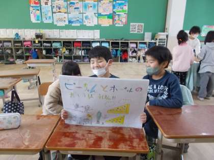国語科「お話のさくしゃになろう」の学習の様子です。自分たちで考えたお話を、劇やペープサート、紙芝居にして表しています。作品作りも大詰めを迎え、練習に励んでいます。