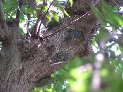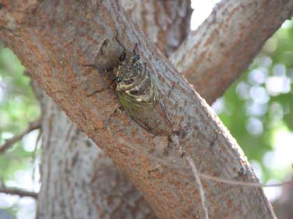 手でつかめそうなところに,クマゼミがいっぱいいます。