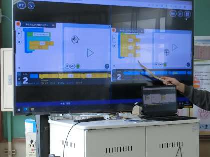昨日、プログラミング能力検定協会の方による出前授業の学習をしたこともあり、子どもたちは、正方形、正三角形、正五角形などを描くプログラミングに楽しく挑戦しました。ところが、実際にプログラムした内容をロイロノートに提出して比較してみると、複雑なプログラムを、「○回繰り返す」を入れることで、簡単に組み立てることに気付いた児童もいました。