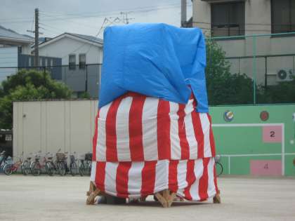 午後4時からの開始が楽しみです。櫓は,いつでも使えるように組んであります。雨があがることを祈っています。