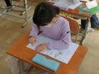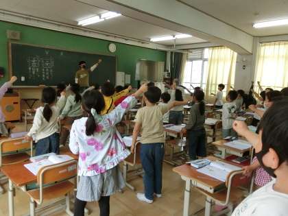 2年生は漢字の学習をしていました。新しく学ぶ漢字は、読み方、筆順、とめ・はね・はらいなど、たくさん学ぶことがあります。えんぴつで書く前に、全身を使って文字を書くと、体で覚えることができそうです。その後に、ノートに丁寧に書いていきます。