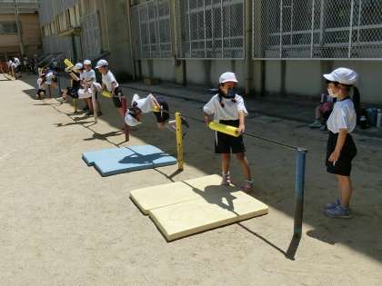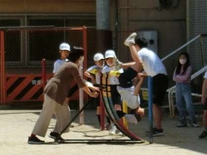 3年生が運動場で鉄棒の学習をしていました。補助具を使って一生懸命に逆上がりに取り組んでいました。何回も何回も失敗して、やっとできるようになった時の子どもの達成感はとても素晴らしい笑顔でした。