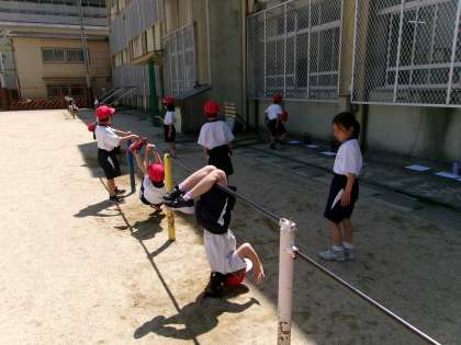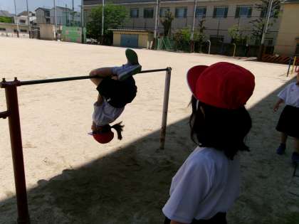 始めは「苦手や」とつぶやいていた子も,少しずつできる技が増えて「逆上がりまでやりたい!」とやる気満々で頑張っています。