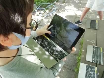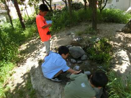 理科の学習で、5月の生き物の様子をビオトープで観察していました。百葉箱の気温や池の水温を測り、季節を数値で客観的に捉えながら、ビオトープで生活する生き物や植物を観察して、GIGA端末で記録していました。継続して観察や記録をすることで、季節の移り変わりや生き物の変化に気付いてほしいと思います。