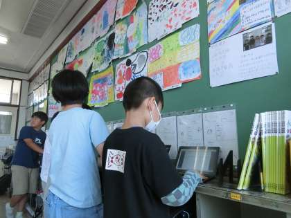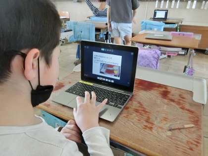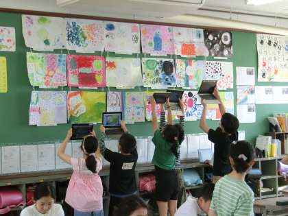 図工で描いた「心のもよう」を鑑賞し、交流しました。吹き流し、スパッタリング、にじみ、ドリッピングなどの技法を使い、画用紙に表現しました。ロイロノートで写真をとり、ワークシートに友だちの作品のよいところや参考にしたいところなどを書きまとめ、交流しました。