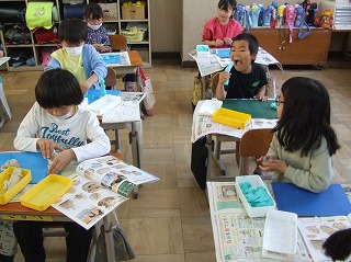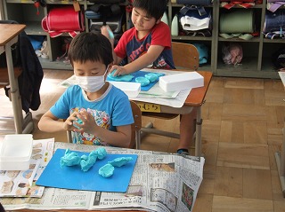 粘土をグッと握った形や、つまんだ形から想像して作品を作りました。