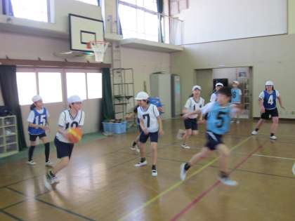 また,リバウンドボールをとるためやパスをカットするためにボールに飛びつくなど,意欲的な動きも見られます。ゲーム展開がスムーズになり、とても楽しそうです。 前半5分、後半5分の間、走り通しの子もいます。パスをつなぐということを意識するようになって,自然と声をかけ合うなど、チームワークを生かした行動が多く見られるようになりました。