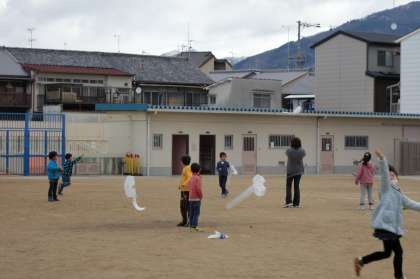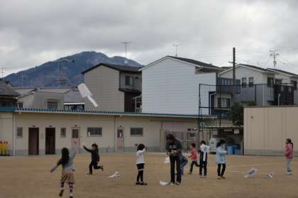 1年生が手作りの凧を持って運動場を走り回っています。糸があまりにも短いということと風が全然吹いていないということ,この二つが重なると,いくら凧といえど大空高く舞い上がってはくれません。