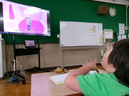 3くみでは毎朝の日常生活の時間に歌を歌う時間があります。今月は「believe」です。手話付きの映像を通して心と身体で歌を表現しています。