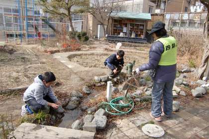 冷たい風が吹き抜け,小雪がちらつく中,ビオトープ委員会の方が来てくださいました。今日は4名で枝の剪定や足元に散らかったままになっていた枯れ枝の整理などをしていただきました。
