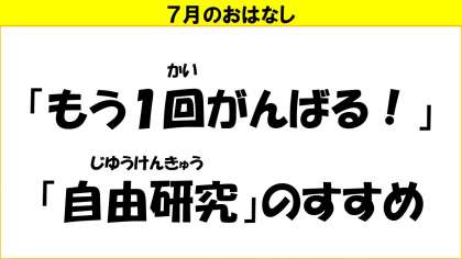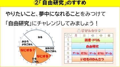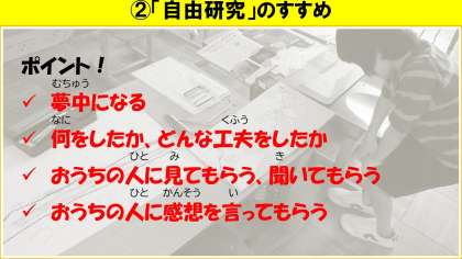 2つ目は「自由研究」の話です。自由研究は、自分の好きなことを好きなだけ取り組める学習です。とにかく、自分のやりたいことに夢中になって、夏休みを楽しんでほしいと思います。そして、取り組んだ自由研究をおうちの人に聞いてもらい、感想を言ってもらえれば、子どもたちは大満足です。今から2学期の自由研究発表会が楽しみです。