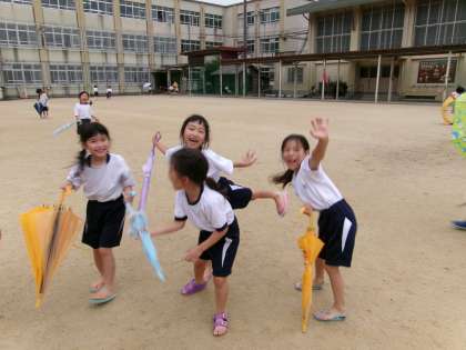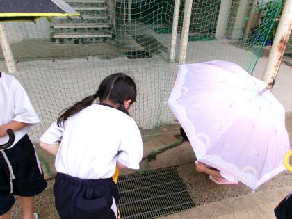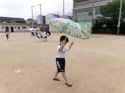 雨の運動場で,雨の日だけのものを一生懸命探していました。雨の音を聞いてみたり,水面の様子を見てみたりと,生き生きと活動することができました。
