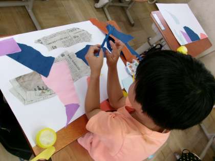 まずは紙を自由に破き,その紙を並べて1つの作品にしていきます。破いてできた形をいろいろな方向から見たり,組み合わせたりして「オムライスに見える!」「サメの歯みたい」と楽しそうに活動していました。