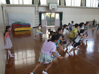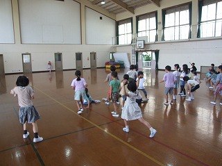 今回は体育館が使えたので、「ドッジボール」と「だるまさんがころんだ」をしました。